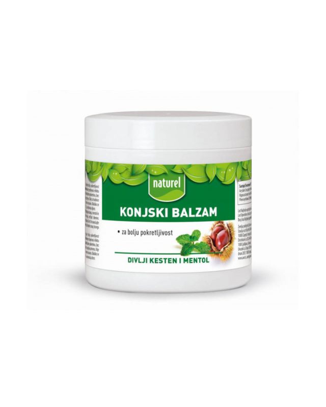 Konjski balzam pospješuje prokrvljenost kože i omogućuje bolju pokretljivost zglobova. Ekstrakt divljeg kestena u kombinaciji s mentolom i kamforom pridonosi efektu laganog hlađenja. Uporaba: nanosi se na kožu i razmazuje laganim kružnim pokretima, bez utrljavanja, nekoliko puta dnevno. Upozorenja: samo za vanjsku primjenu. Nije za trudnice i djecu mlađu od 6 godina. Izbjegavati kontakt sa sluznicom i otvorenim ranama. Ukoliko se pojavi iritacija, prekinuti uporabu. Sastojci (INCI): Aqua, , Acrylates/C10-30 Alkyl, Acrylate Crosspolymer, Propylen Glycol, Aesculus Hippocastanum Seed Extract, Menthol, Camphor, Ethanol, , Phenoxyethanol, Ethylhexylglycerin, Sodium Hidroxide. Čuvati na temperaturi do 25 ˚C, izvan dohvata djece.